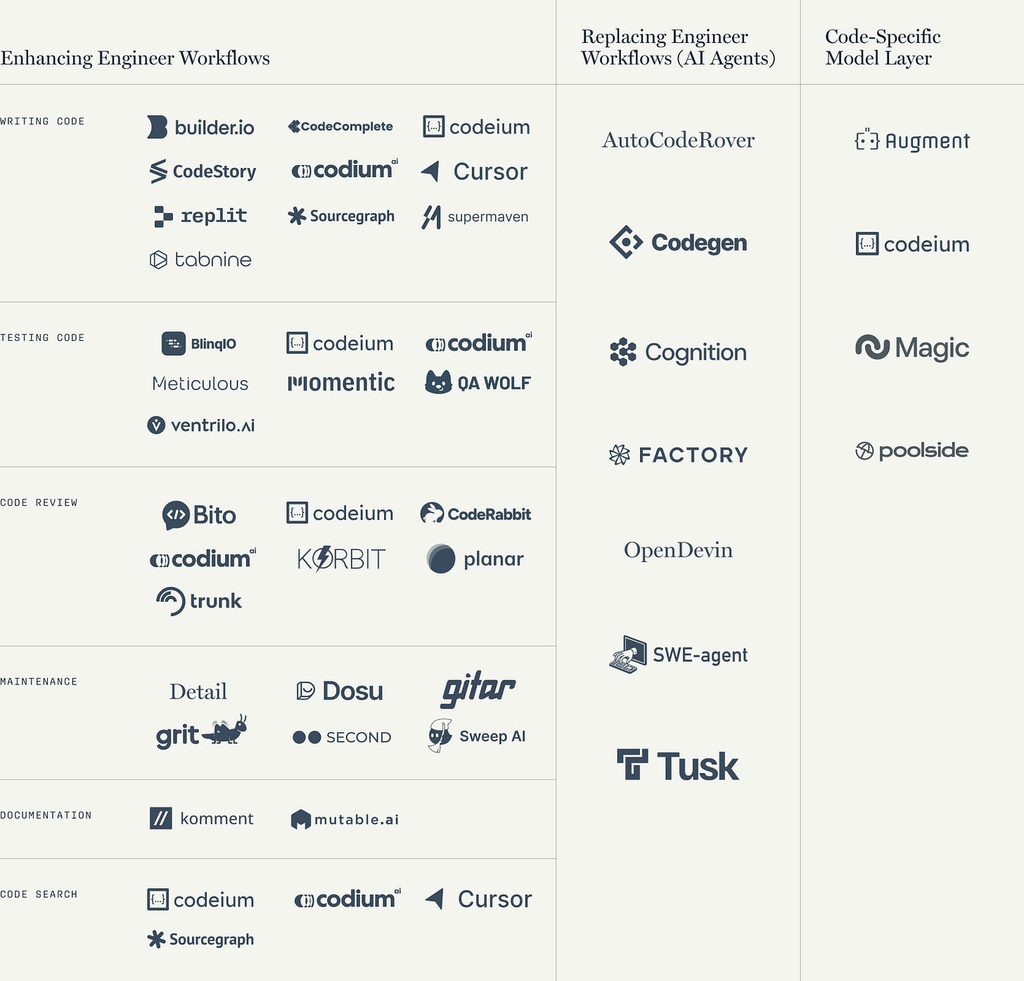 The code copilot landscape has grown a lot in the last 2 years. The number of players that launched is a clear testament that software development is one of the fields that will gain most from LLMs: